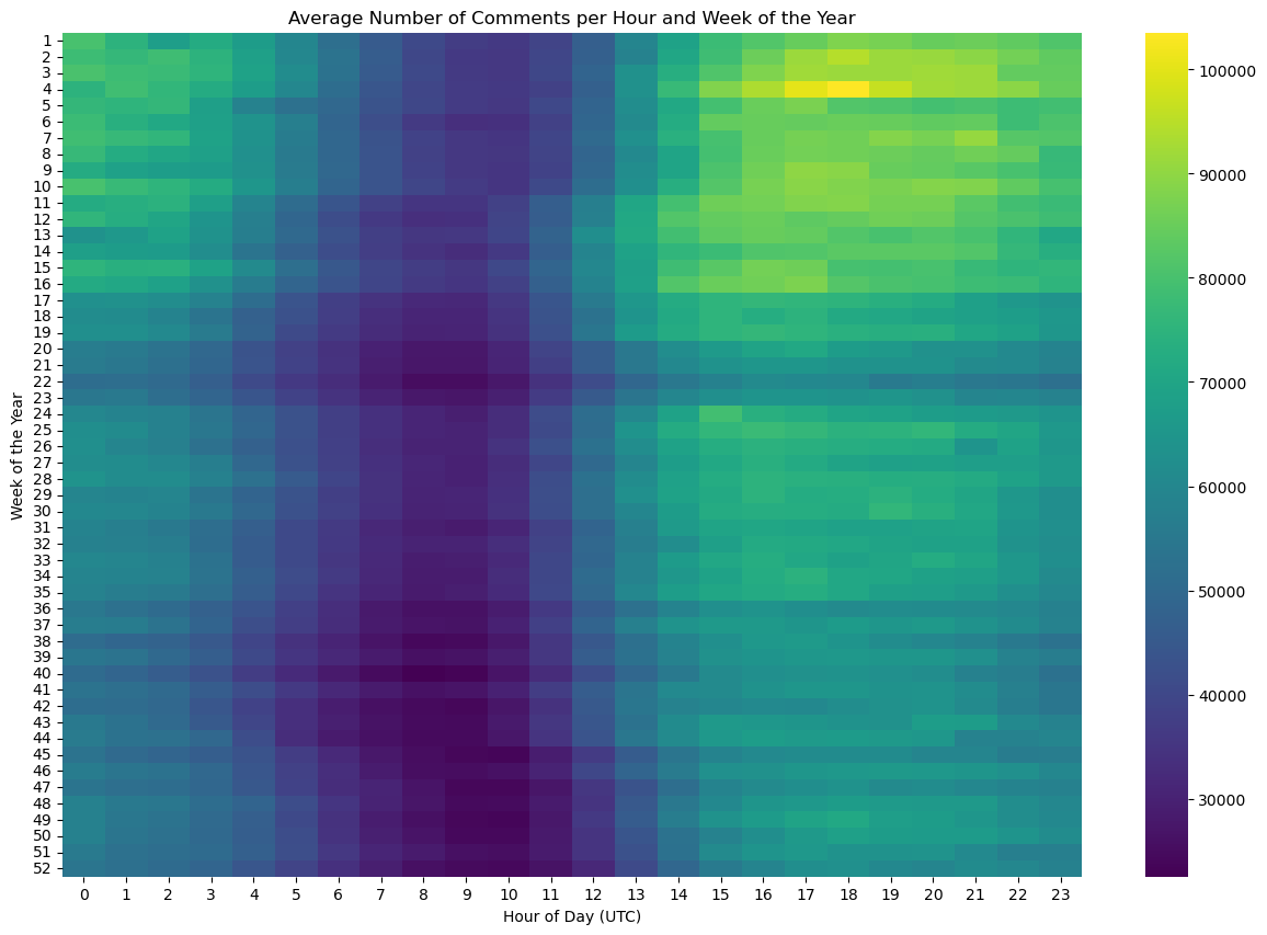 To determine the times of day when a post typically receives the most engagement, we create two additional variables: week_of_the_year and hour_of_the_day, both coming from the created_utc column. We remove the first two days of 2022 as these would be considered part of week 53 of 2021. Then, we can group and pivot the count of our new variables, resulting in the Figure 4: