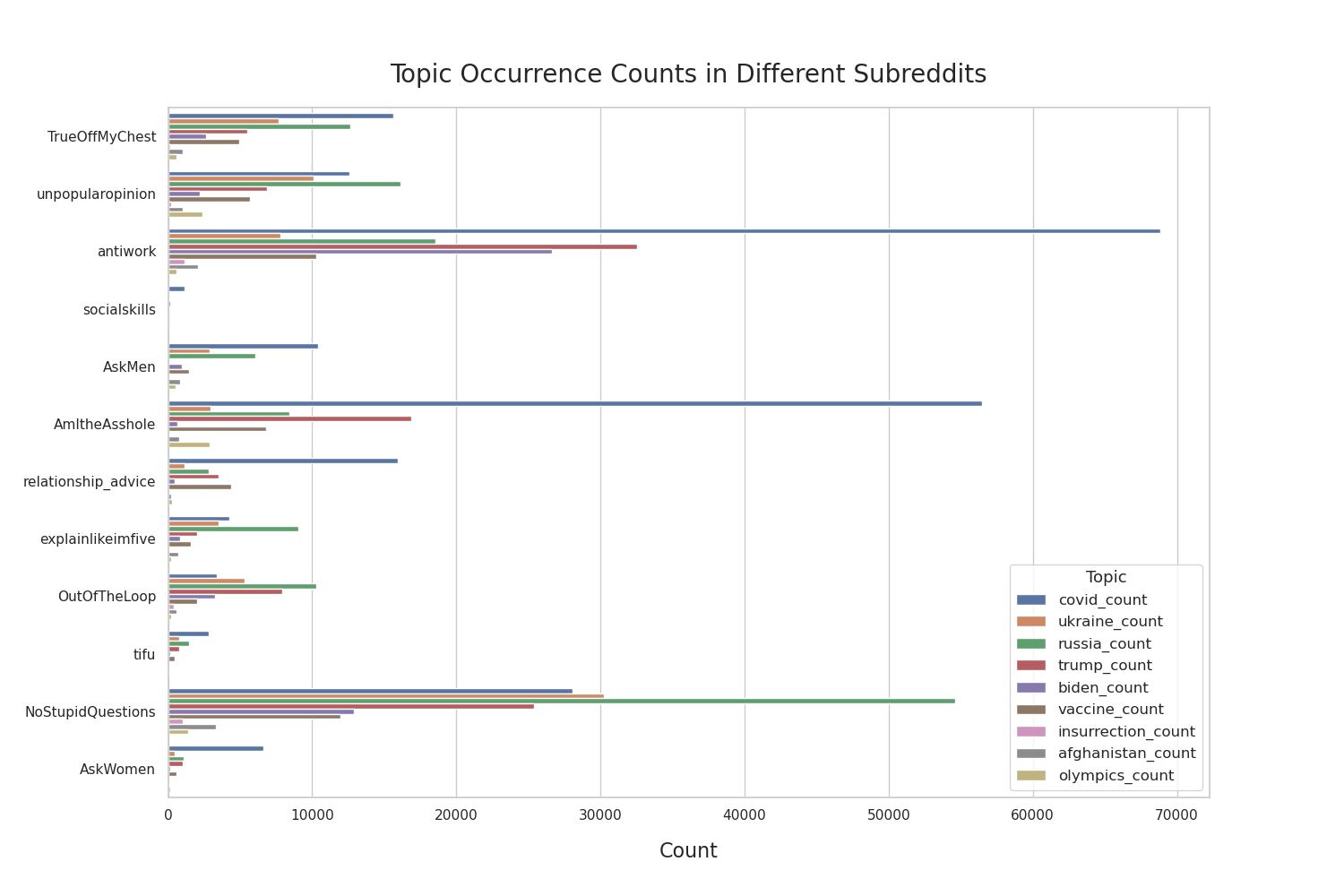 In this section, we want to see whether popular topics that we’ve chosen are talked about and to take that a step further, the narratives that we have chosen from popular topics are broken down in each subreddit. Figure 8 below paints a clear picture of which subreddits have engagement related to the stories we are interested in exploring and shows the degree of engagement with comparisons to other subreddits and topics.