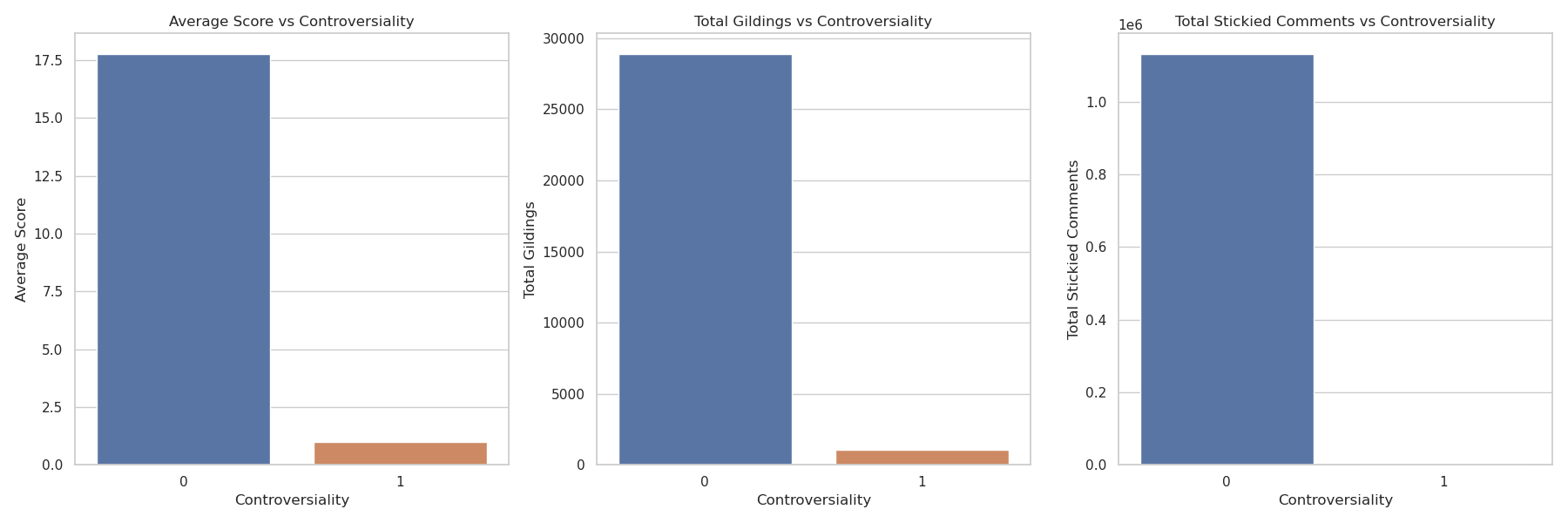 Another element of this exploration of stories that we wanted to understand was the impact the“controversiality” would have on other engagement metrics in the dataset. Below we look at the “scores”, “gildings”, and whether a comment was “stickied” for both controversial (1) and non-controversial (0) comments. From Figure 9, we can clearly see that the “controversial” metric does not have a positive impact on any of the engagement metrics that were identified in our exploratory data analysis.
