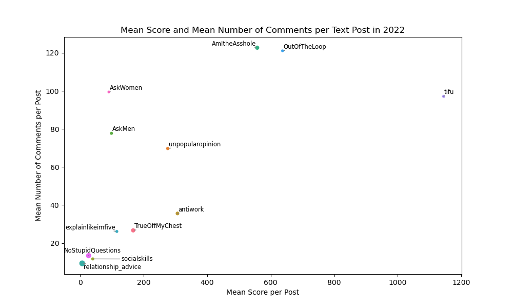 We selected a subset of the data related to subreddits dedicated to storytelling during 2022. Namely, we chose the 12 subreddits r/AITA, r/AskMen, r/AskWomen, r/TrueOffMyChest, r/unpopularopinion, r/tifu, r/socialskills, r/antiwork, r/relationship_advice, r/explainlikeimfive, r/OutOfTheLoop, and r/NoStupidQuestions.