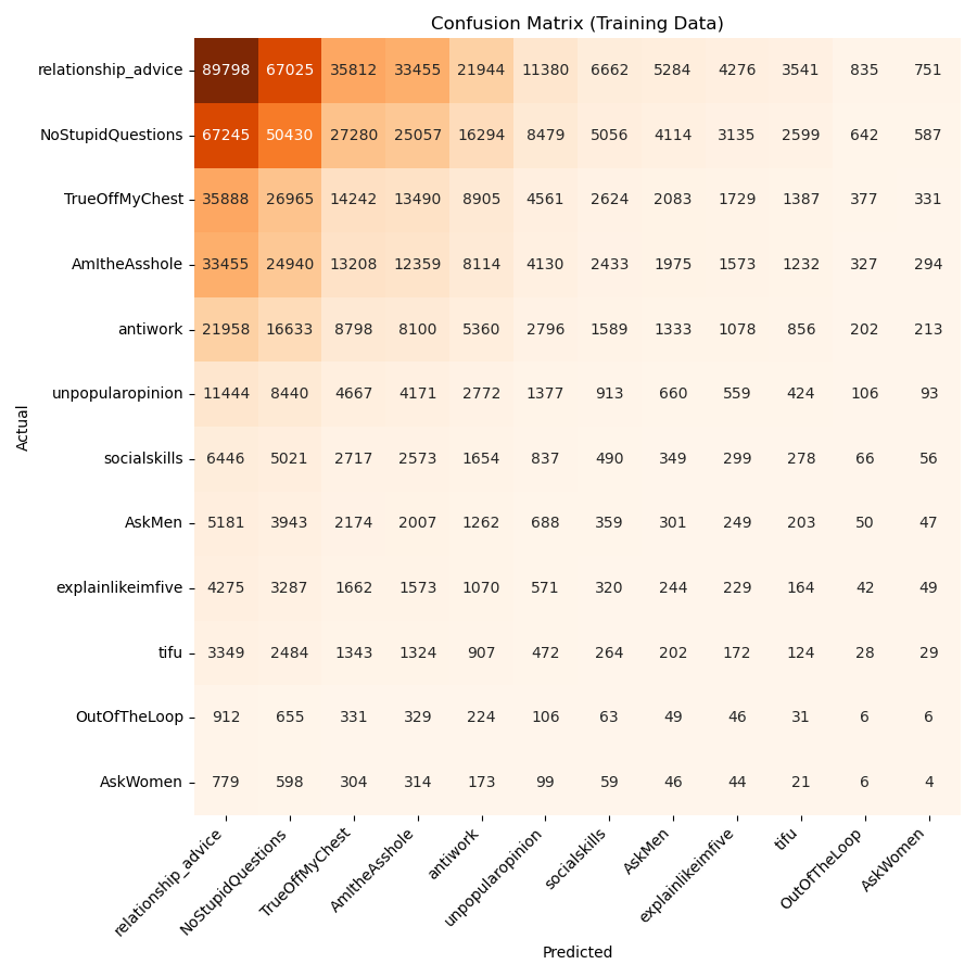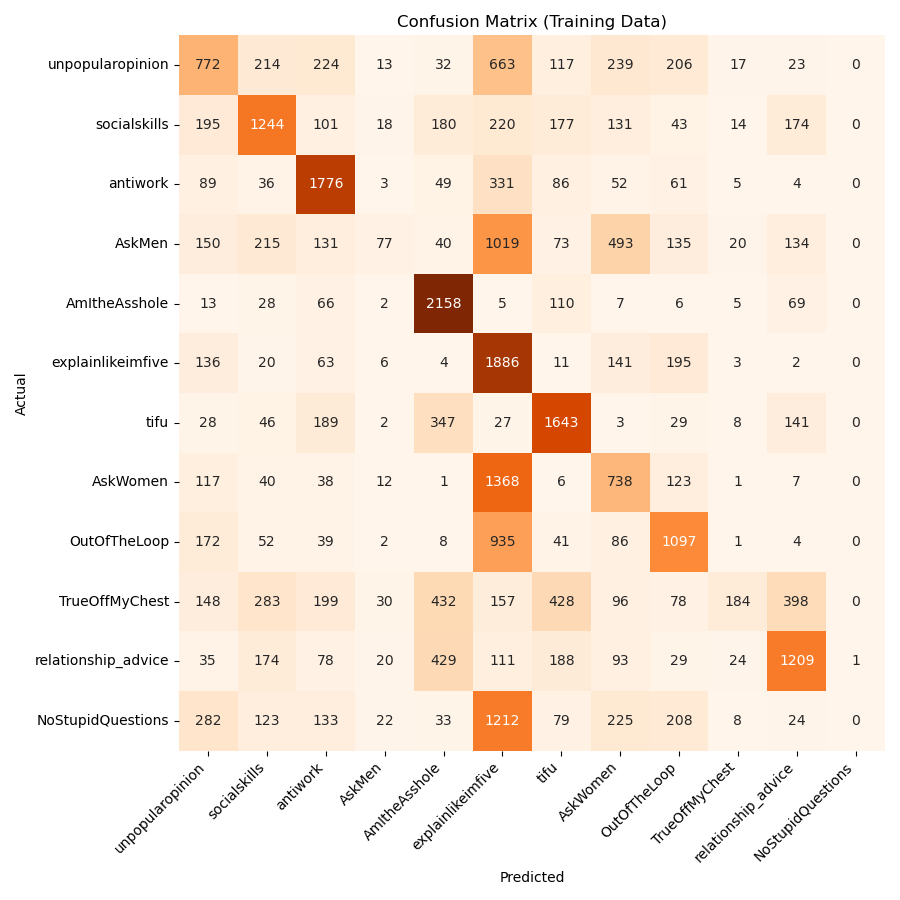 Below, in Figure 3, we can see the results of the Random Forest model predictions on the downsampled, balanced training data. Here, the model predicts each subreddit some number of times without really avoiding any of them, as it did with the full, unbalanced dataset. For most subreddits, the model correctly predicts the subreddit most often. However, there are still many instances where the model predicts incorrectly, especially in subreddits like r/AskMen and r/NoStupidQuestions.