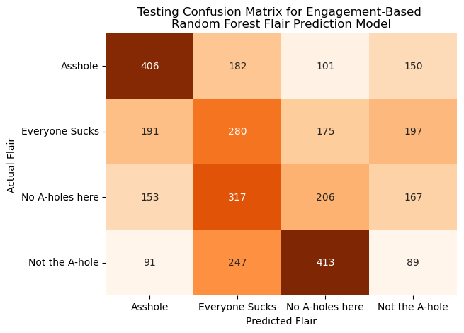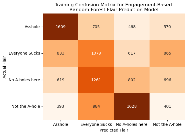 Subsequently, we attempt to predict the flairs of posts in r/AmItheA**hole (r/AITA) using various possible predictors. We apply two Random Forest models using the text of posts in r/AITA and the user engagement on these posts, respectively. Similar to our first classification task, these models perform better than a blind guess or baseline but still have much room for improvement.