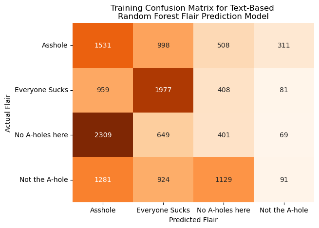 Based on the metrics above, this model did not predict the flairs of these posts particularly accurately, but performed better than a blind random guess, which would have a theoretical accuracy of 25% compared to our model’s ~30-40%. For both the training and testing subsets, the model did an extremely poor job at predicting “Not the A-hole posts”. This model does perform reasonably well when predicting “Everyone Sucks” and “_A**hole_” flaired posts, but does not predict the posts with the more positively connoted flairs (No A-holes here and Not the A-hole).