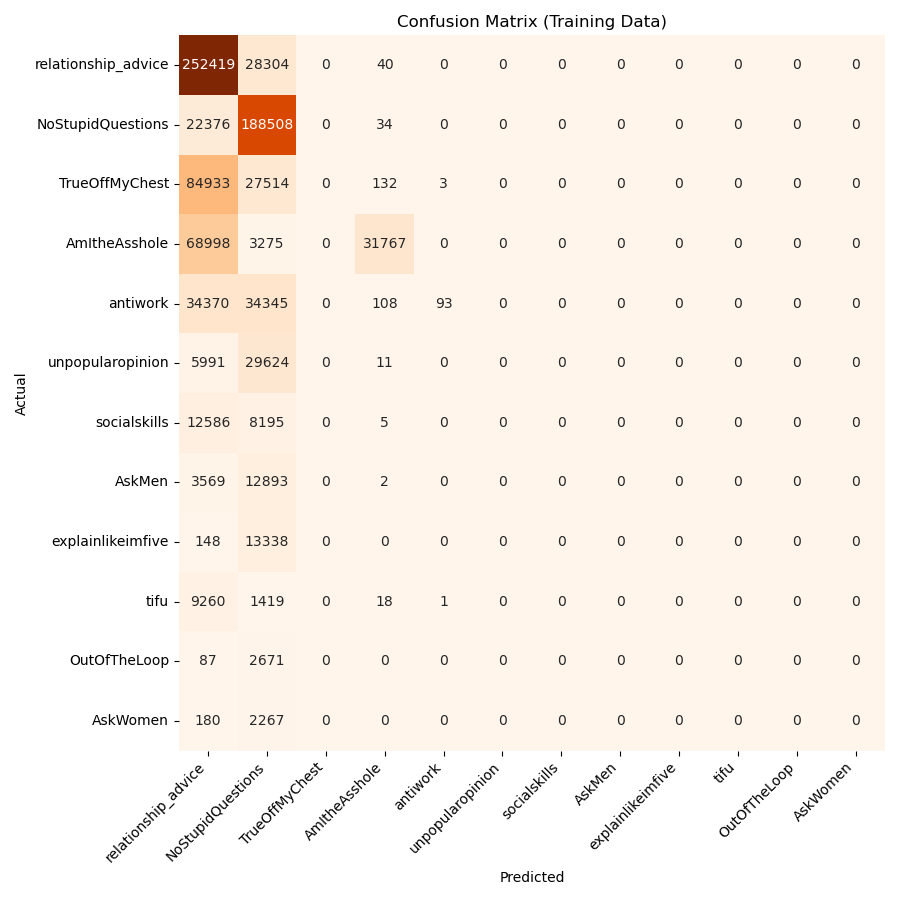 Below, in Figure 2, we can see the results of the Random Forest model predictions on the training data. Here, the model outperforms the baseline model but still has its downfalls. The model predicts the two most prevalent subreddits, r/relationship_advice and r/NoStupidQuestions, nearly every time, failing to predict any less prevalent subreddits. In this sense, the model is vastly underperforming, as it is heavily biased to the subreddits it has seen more often.