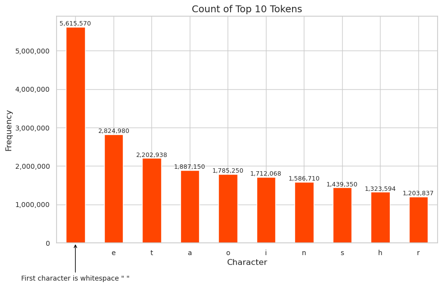 We then combined the text sources. The data underwent a series of NLP transformations, including custom tokenization and lowercasing, to prepare it for advanced analysis. We constructed a vocabulary and transformed the individual characters into tokens. The resulting frequency of each token is shown in Figure 6. Lastly, we stored the processed data in a structured Parquet format alongside the character-to-index mappings, crucial for the subsequent machine-learning modeling.