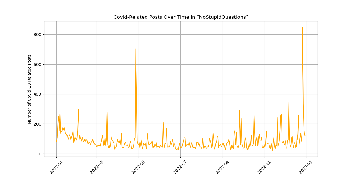 After identifying “NoStupidQuestions” as the subreddit that we would investigate for topics related to Covid-19 trends, we created a plot that should convey its interest over time in this particular subreddit. Separately, the research integrated Reddit submissions with classic literature texts, employing detailed NLP transformations and data filtering. This preparation will facilitate the development of the input data to train a recurrent neural network (RNN) that will generate new story submissions.