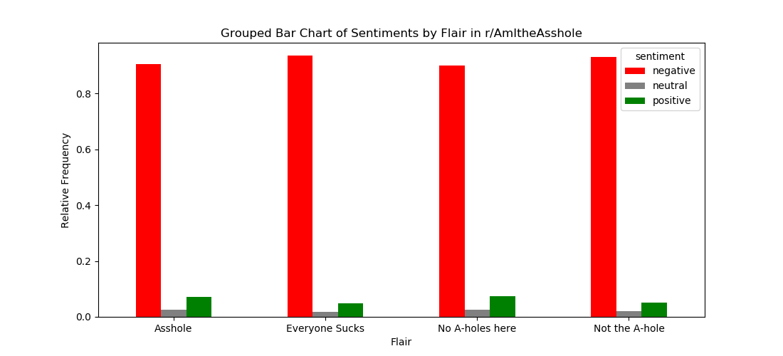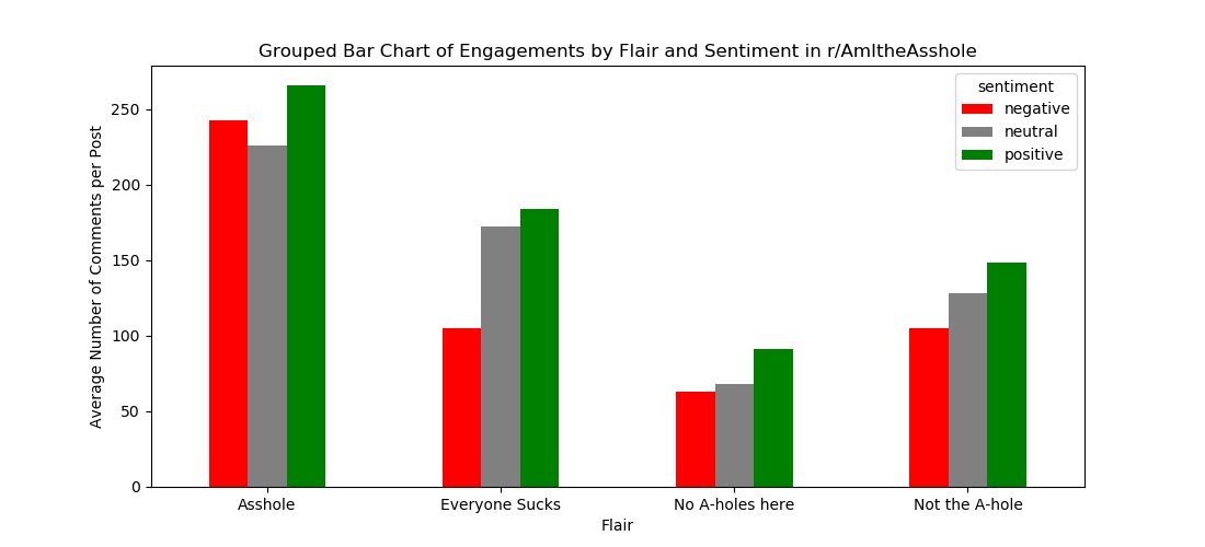 From this plot above, we can extract several conclusions. We can see that posts assigned the “A*hole” flair receive the most user engagement (on average), and posts assigned “No A-holes here” receive the least engagement, on average. Additionally, posts assigned a “negative” sentiment receive less user engagement than those with a “positive” sentiment across all four primary flairs. Thus, it is possible there could be a relationship wherein the more “positive” a post’s sentiment/writing is, the more likely it is to receive more engagement (at least in the form of the number of comments).