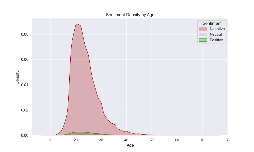 In Figure 3, we can see a density plot of the age of the author of a post, grouped by the categorized sentiment of the post itself. There doesn’t seem to be much difference between the distribution of ages for each sentiment, as each seems to peak around ages between 18 and 25 years old. Furthermore, we can see that most posts contain negative sentiment - likely posts written about negative experiences and asking for advice.