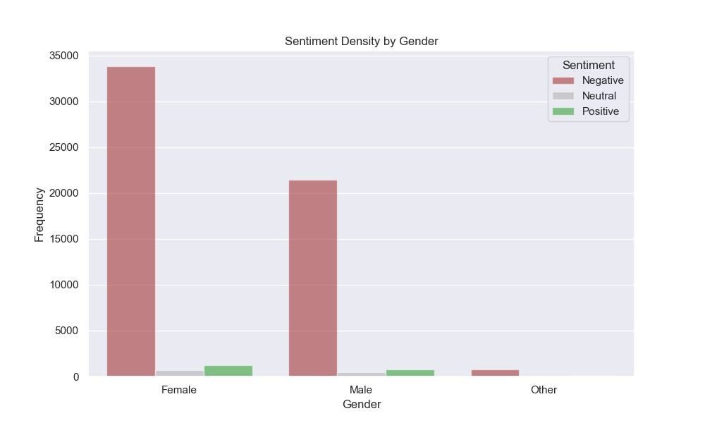 We can visualize similar features regarding the identified gender of the author of a post in Figure 4. Here, we can see the distribution of categorized sentiment of posts grouped by the identified gender of the post’s author. Again, the distribution of sentiments across genders is relatively similar, with most posts containing negative sentiment.